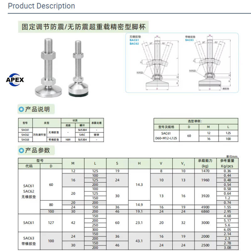 In industrial and commercial settings, achieving perfect leveling and stable support for machinery, workstations, and sensitive equipment is often complicated by uneven floors or the need for precise angular alignment. Standard fixed feet fall short in these scenarios. This is where advanced adjustable leveling feet become essential. The SAC Series Universal Leveling Mounts from Apex Coupling provide an engineered solution, offering not only height adjustment but also the unique ability to compensate for surface tilt, making them the ideal choice for demanding installations where precision is paramount. Investing in high-quality adjustable leveling feet ensures long-term stability and protection for your valuable assets.