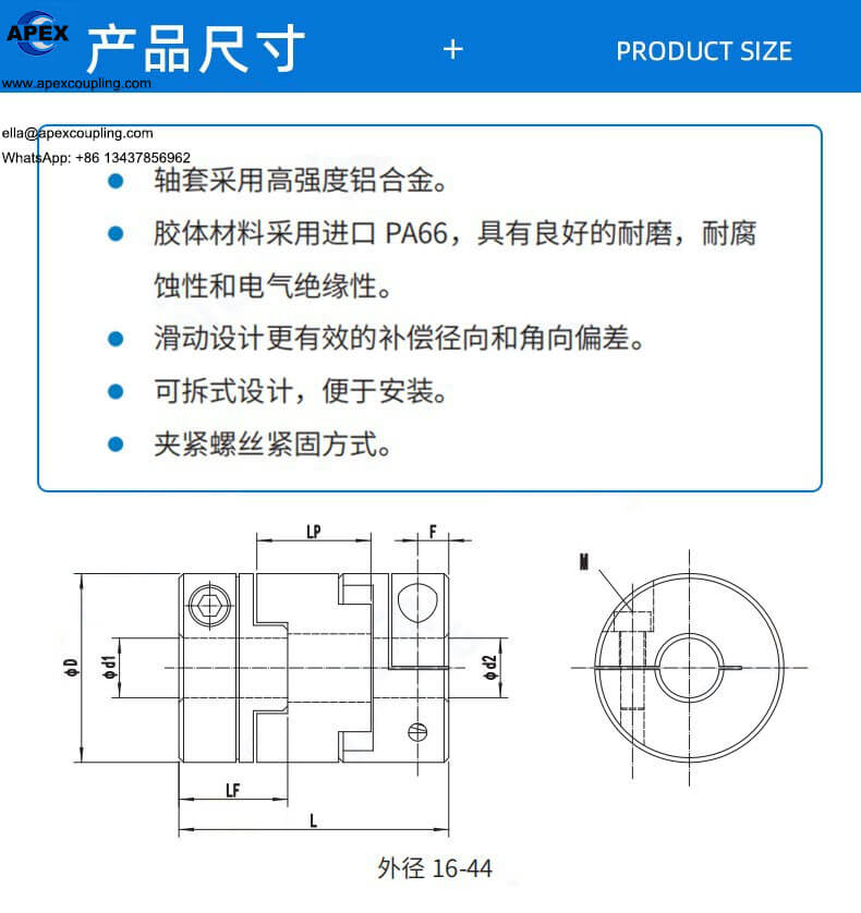 Made from high-strength aluminum alloy with a PA66 middle disc, this coupling offers excellent wear resistance, corrosion resistance, and electrical insulation.