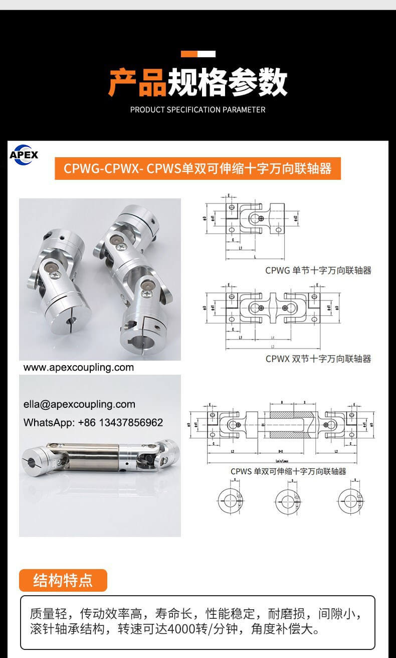 The aluminum universal joint coupling from Apexcoupling is a high precision transmission component designed for high-speed and flexible motion systems. Featuring a lightweight aluminum structure combined with needle bearing cross joints, this coupling ensures smooth operation, low friction, and long service life.
