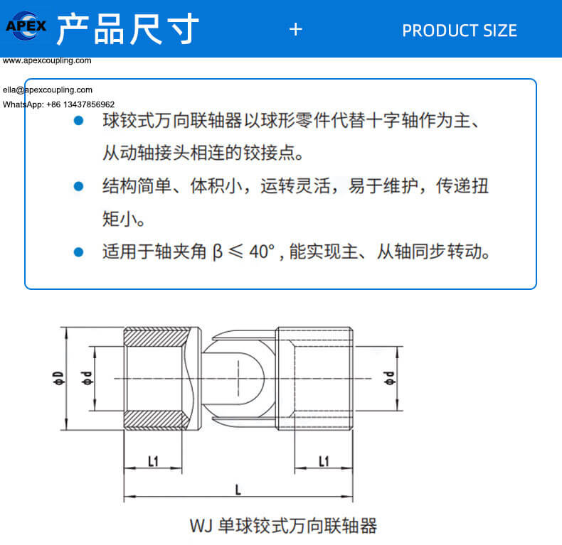 The ball joint universal coupling (WJ/WJS type) from Apexcoupling is a compact and flexible transmission solution designed for applications requiring smooth motion and simple structure. Unlike traditional cross shaft universal joints, this coupling uses a spherical joint to connect the driving and driven shafts.