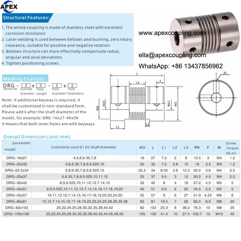 Flexible Design: The bellows structure effectively compensates for radial, angular, and axial misalignments, making the coupling adaptable for various applications.