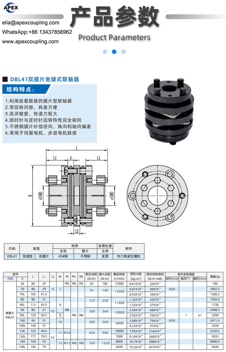 The DBL41 Double Diaphragm Keyless Coupling is a precision flexible coupling designed for high-performance servo and stepper motor applications. Featuring a keyless taper clamp (shrink disc) connection, this coupling delivers zero backlash, high torsional stiffness, and exceptional torque capacity. The double 304 stainless steel diaphragm compensates for angular, parallel, and axial misalignment while maintaining high-speed capability up to 15,000 rpm.