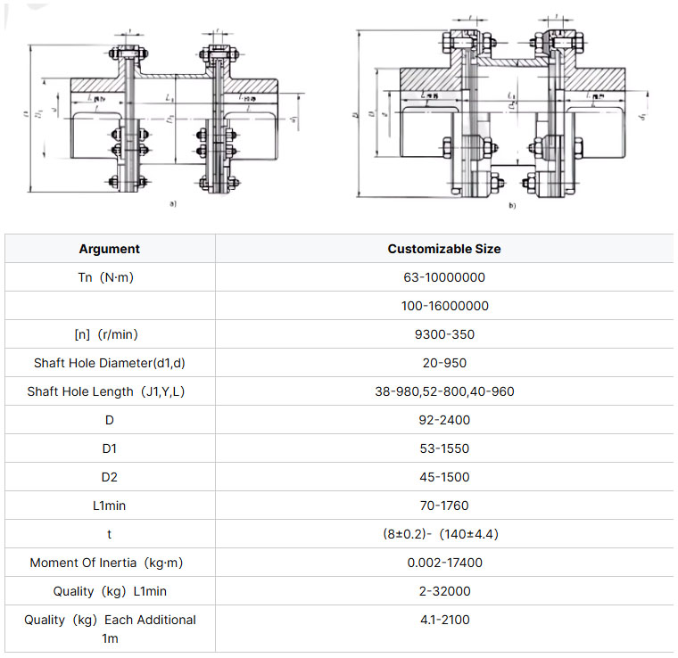 Engineered for critical applications in industries such as power generation, chemical processing, marine propulsion, and heavy machinery, this diaphragm coupling offers exceptional performance where reliability and precision are paramount. The all-metal construction ensures longevity in harsh environments, while the balanced design allows for high-speed operation without vibration or resonance issues. With its ability to handle high torque loads while providing excellent misalignment capabilities, the double disc coupling serves as an ideal solution for pumps, compressors, turbines, generators, and other high-performance mechanical systems requiring precise power transmission.