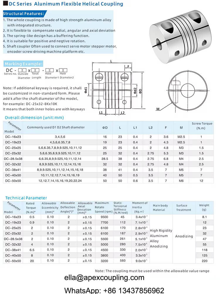 In the world of precision motion control, where accuracy, zero backlash, and reliability are non-negotiable, the Helical Coupling stands out as a superior solution. Apexcoupling is proud to manufacture the DC series, a high-performance Helical Coupling crafted from lightweight yet durable aluminum alloy. This specific type of Helical Coupling is engineered with a unique one-piece, single- or multi-start helical cut design that provides exceptional torsional stiffness while accommodating parallel and angular misalignments. Unlike traditional jaw or elastomeric couplings, the Helical Coupling offers virtually zero backlash, making it the ideal choice for servo-driven applications, CNC machinery, and particularly, high-accuracy 3D printers. As a leading factory, we provide both standard models and fully customized Helical Coupling solutions through our OEM services, ensuring a perfect match for your most demanding drive system requirements.