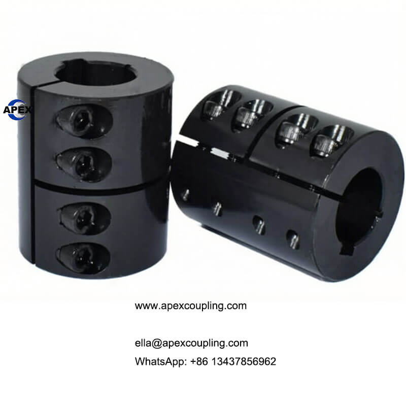 Two-piece clamp design – Halves are bolted together around the shaft ends
