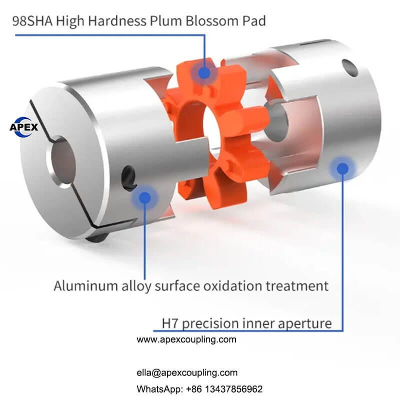 • Three-Piece Construction: Two precision-machined hubs and one elastomeric spider create a flexible connection that accommodates angular and parallel misalignment while transmitting torque smoothly.