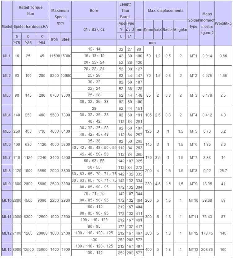 Particularly suitable for hydraulic systems, pump applications, and high-torque machinery, the ML coupling’s compact design makes it ideal for applications with limited space. The availability of spiders in different materials and hardness levels allows for customization based on specific operational needs, whether for high-temperature resistance, chemical compatibility, or specific damping characteristics. With standard sizing that ensures interchangeability and multiple fixation methods, this coupling offers both performance versatility and installation flexibility.