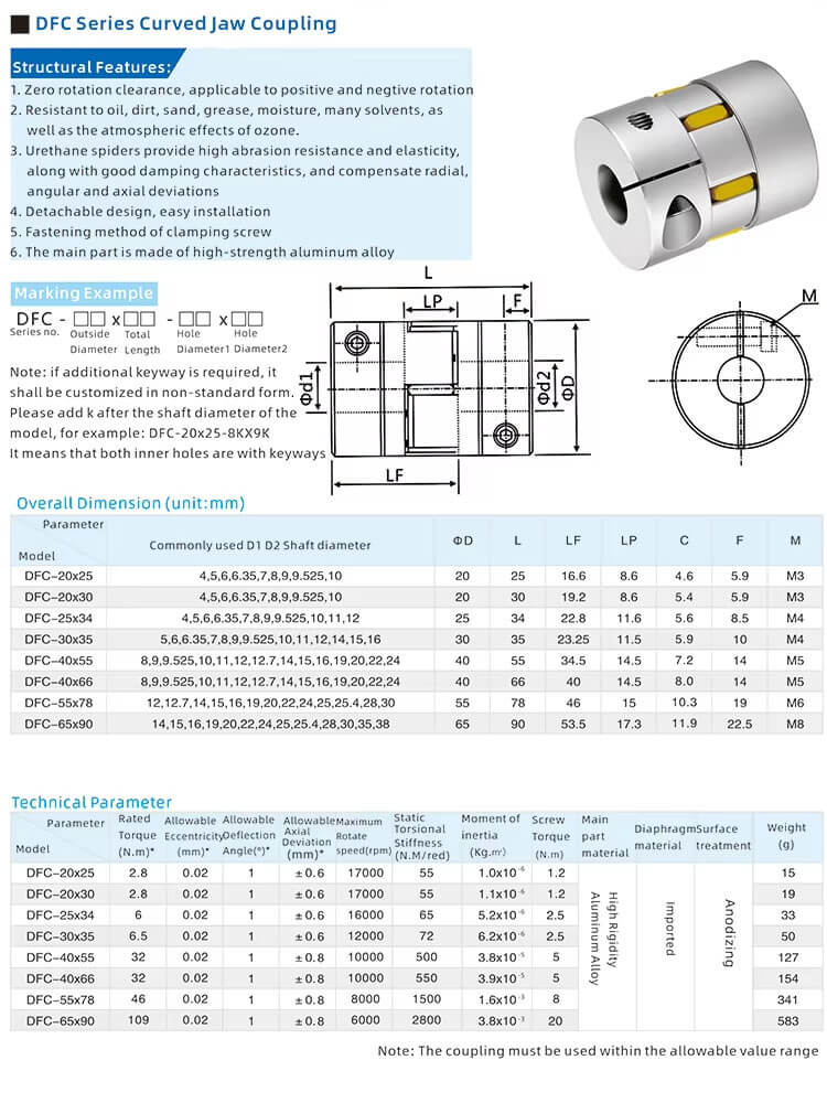The fastening method uses a clamping screw design, ensuring secure shaft connection and reliable torque transfer. With a rated torque of up to 2000 N·m and a maximum speed of 1000 RPM, this spider jaw coupling is suitable for various medium-to-high load applications. Bore sizes range from 3 mm to 8 mm, and customized bores or keyways can be provided upon request.