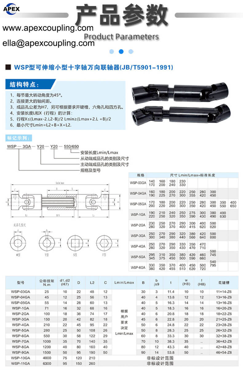 The WSP Series Telescopic Universal Joint is engineered for industrial applications requiring torque transmission over varying shaft distances. Manufactured in strict accordance with the JB/T5901-1991 standard, these joints combine a precision spline structure with high-strength 42CrMo alloy steel, offering a robust solution for CNC machinery, printing equipment, and automated production lines.